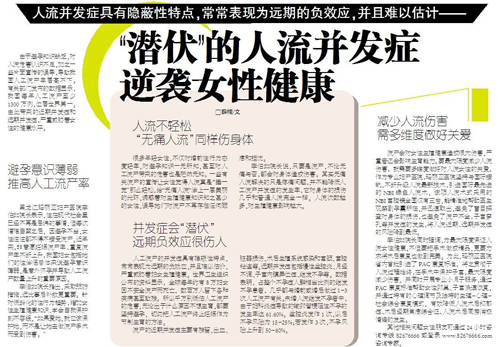 本报讯 (薛楠)由于避孕知识缺乏,对人流危害认识不足,加之一些片面宣传的误导,导致我国人工流产率居高不下。有关部门发布的数据显示,我国每年人工流产至少1300万例,位居世界第一。由此带来的近期并发症和远期并发症,严重威胁着女性的健康水平。