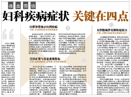 本报讯(薛楠)女性从青春萌发直至更年衰老,几乎没有不患疾病的,尤其是女性生殖器官系统疾患,在一生中都难免发生。黑龙江玛丽亚妇产医院妇科主任陈凤指出,妇科疾病大体可分以下几类:炎症、创伤、功能性失调、肿瘤和畸形等,主要是在外阴、阴道、子宫颈、子宫体和输卵管以及卵巢部位发生上述症状。由于患病的部位不同,患病的种类不同,因此临床上表现出名目繁多的症状和体征,但主要表现还是在这四点上:痛、血、带、块。