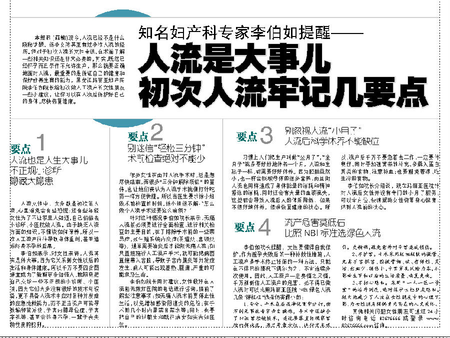 李伯如院长同时建议,女性最好在人流前先拨打医院的电话进行咨询,提前了解些注意事项:如可视人流术前要停止性生活,以免增加感染阴道炎的危险;在手术前几小时内需禁食禁水等;同时,也要把自己的过敏史和既往病史如实告知医生。