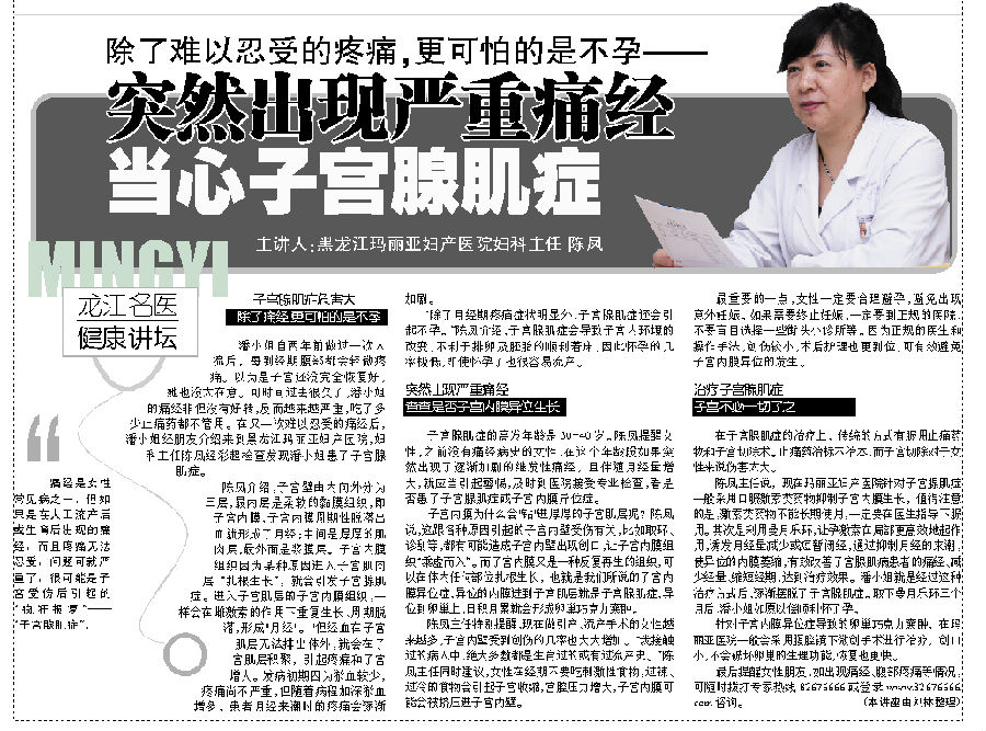 子宫腺肌症的高发年龄是30—40岁。陈凤提醒女性,之前没有痛经病史的女性,在这个年龄段如果突然出现了逐渐加剧的继发性痛经,且伴随月经量增大,就应当引起警惕,及时到医院接受专业检查,看是否患了子宫腺肌症或子宫内膜异位症。